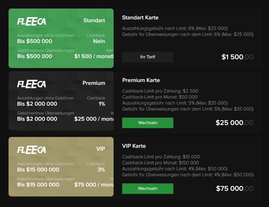 Je teurer die Karte ist, desto günstiger sind die Nutzungskonditionen, aber auch die Wartungskosten steigen. Jeden Monat wird Ihnen ein bestimmter Betrag von der Karte abgebucht (abhängig vom Kartentyp).