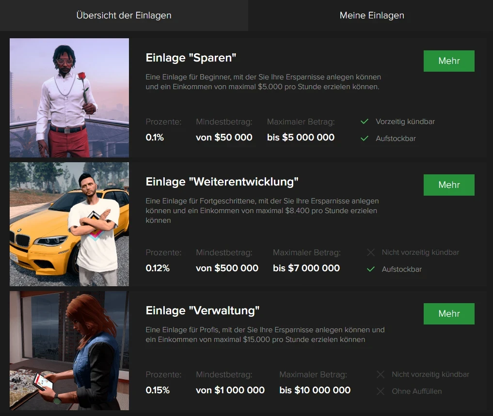 Je nach den Bedingungen begrenzen Einlagen den investierten Betrag und bestimmte Optionen. Je komplexer die Bedingungen und je mehr Geld investiert wird, desto höher ist der Endgewinn. Die Einlagenerträge werden automatisch an jedem Zahltermin berechnet. Beim Anlegen einer Einlage geben Sie den Betrag und die Anzahl der Stunden an, für die die Einlage geöffnet sein soll. Nach der Eingabe der Daten berechnet das System Ihren Gesamtertrag, den Sie bei Schließung des Depots erhalten.