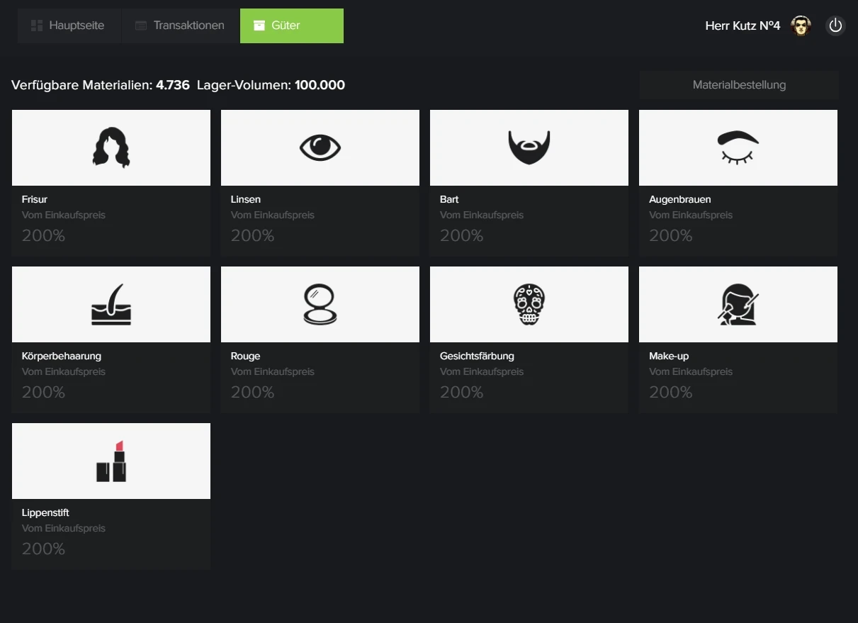 Um Waren oder Ressourcen einzurichten und zu kaufen, öffnen Sie bitte die spezielle Anwendung auf Ihrem "My Business"-Tablet und gehen Sie zum Abschnitt "Waren". Durch einfaches Tippen auf einen Artikel können Sie die Kosten für jeden Artikel individuell festlegen und einen Kauf tätigen.