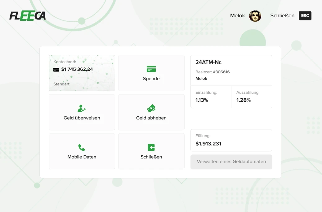 Der Kauf eines Geldautomaten ist ein Prozess, der über den Marktplatz, die Marktplatz-Auktion, die Verwendung des Etiketts auf dem Geldautomaten oder den möglichen "Hand-zu-Hand"-Kauf von anderen Spielern möglich ist.Bitte beachten Sie: Wenn Sie weniger als 5 Stunden pro Woche online sind, kann Ihr Unternehmen Ihnen weggenommen werden. Sollten Sie einmal eine Woche nicht online sein können, informieren Sie bitte die Administration darüber.