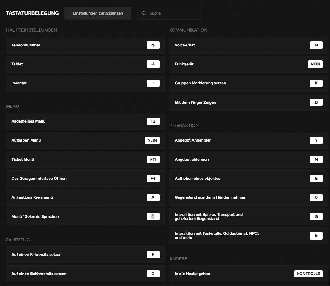 I - Öffnet oder schließt das Inventar deines Charakters.J - Ermöglicht das Anlegen des Sicherheitsgurtes, wenn du dich in einem Auto befindest.B - Startet oder stoppt den Motor des Fahrzeugs, wenn du dich im Auto befindest. Wenn du nicht im Auto sitzt, zeigt deine Figur in die Richtung, in die du schaust.L - Öffnet oder schließt das Fahrzeug.Yo (oder Tilde) - Aktiviert den Cursor auf dem Bildschirm, wenn Sie auf eines der Interface-Elemente klicken müssen.