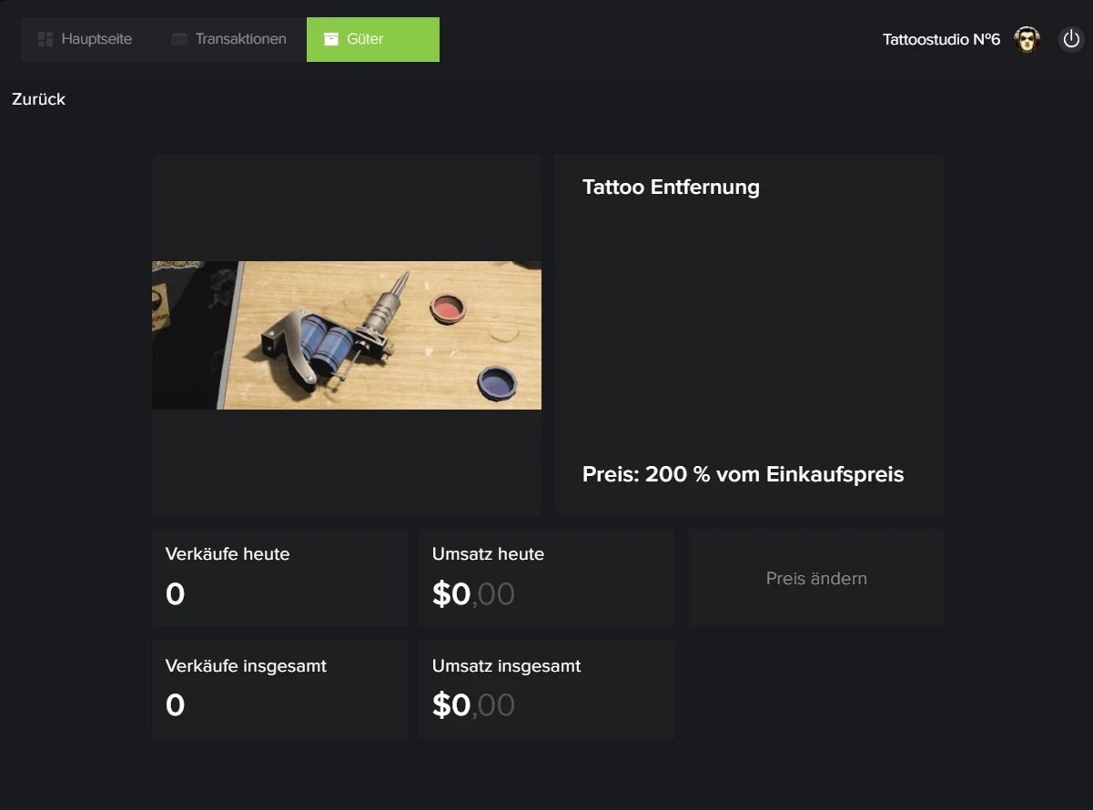 Der Kauf eines Tattoo-Studios ist über den Marktplatz, Auktionen auf dem Marktplatz oder direkte Käufe von anderen Spielern möglich. Bitte beachten Sie: Wenn Sie weniger als 5 Stunden pro Woche online sind, kann Ihr Unternehmen Ihnen weggenommen werden. Sollten Sie einmal eine Woche nicht online sein können, informieren Sie bitte die Administration darüber.