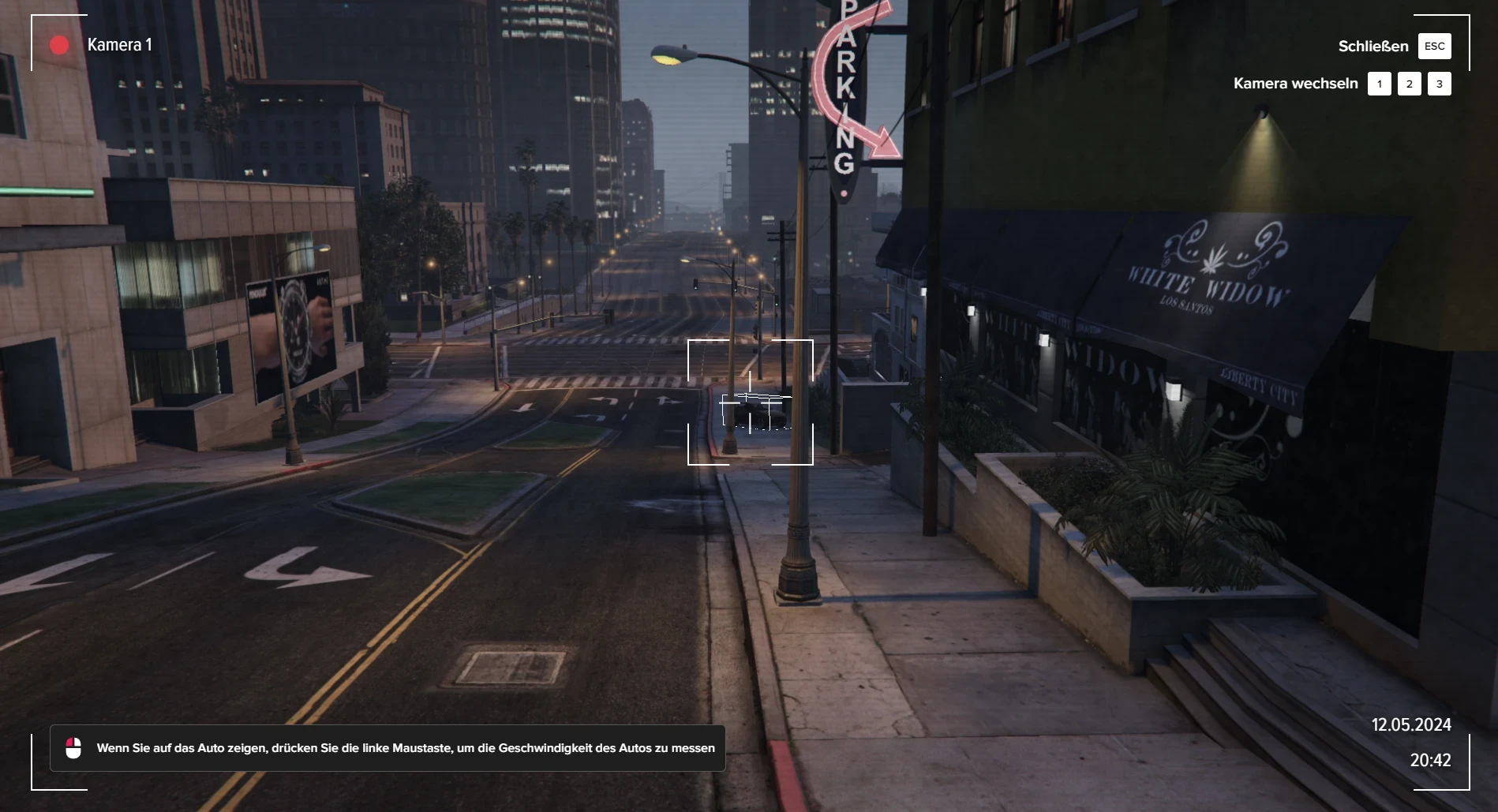 Der Beamte, der die Kamera bedient, kann die Geschwindigkeit des Verkehrs messen, indem er die linke Maustaste gedrückt hält. Bei Geschwindigkeiten über 160 km/h wird ein Strafzettel ausgestellt. Der Beamte erhält 70 % des Bußgeldes, und 10 % werden auf das Konto seiner Organisation überwiesen. An den Kreuzungen sind 2 bis 3 Kameras installiert, zwischen denen Sie mit den Tasten 1, 2 und 3 umschalten können. Die Höhe des Bußgeldes hängt vom Grad der Geschwindigkeitsüberschreitung ab, wird aber pro Fahrer nicht öfter als einmal alle 20 Minuten erhoben. Wenn das Fahrzeug kein Kennzeichen hat, wird kein Bußgeld verhängt. Andernfalls wird das Bußgeld nach den folgenden Parametern berechnet: