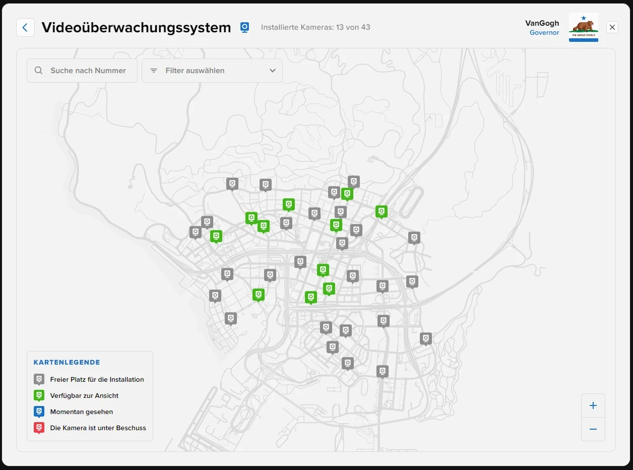 In den Tablets von Organisationen LSPD, LSCSD, Government und FIB gibt es einen Bereich, der der Videoüberwachung gewidmet ist. Um auf die Übertragung zuzugreifen, müssen Sie den Bereich mit der installierten Kamera auswählen, diese wird grün symbolisiert, Jede Kamera kann nur von einem Mitarbeiter gleichzeitig eingesehen werden.