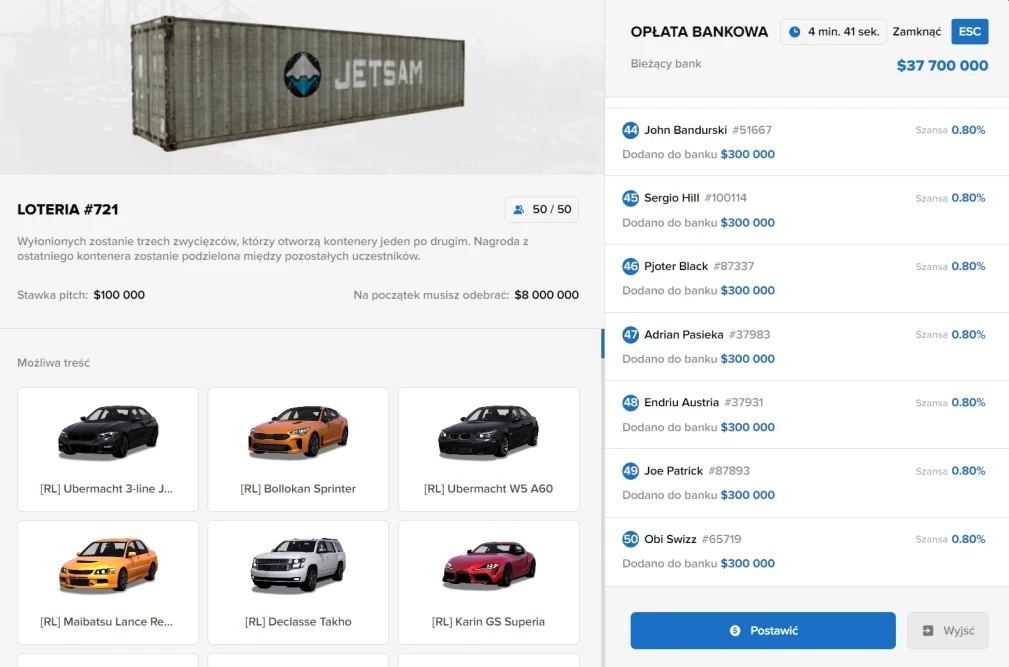 Chcesz wydać swoje pieniądze na coś typu wojen magazynowych? Bez problemu! Serwer oferuje system aukcji kontenerów z których można wygrać ciekawe, drogie, jak i tańsze samochody.