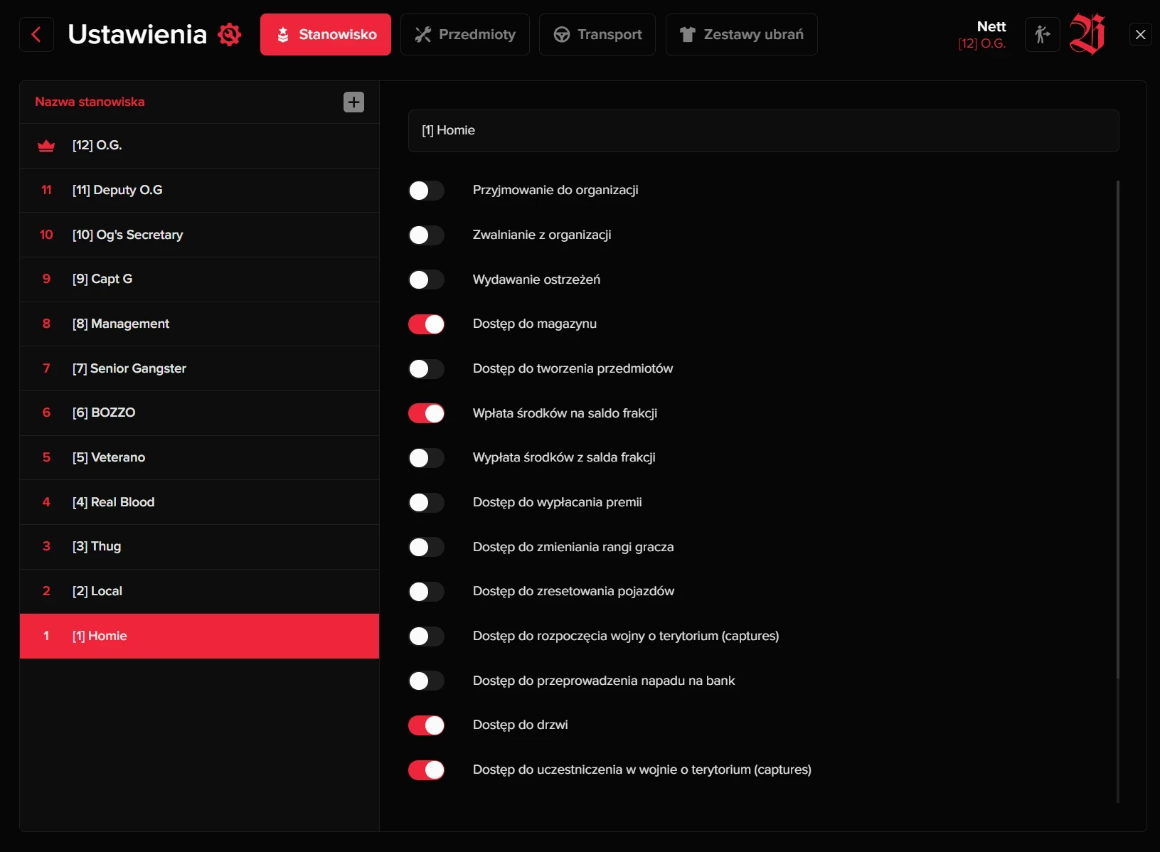 Lider gangu ma możliwość konfigurowania systemu rang, w tym zmiany nazw rang i udzielania dostępu do różnych funkcji frakcji.