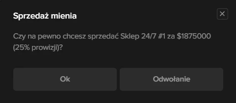 "W przypadku decyzji o sprzedaży biznesu państwu można to zrobić za 75% jego wartości rynkowej, pod warunkiem uiszczenia prowizji w wysokości 25%. Proces sprzedaży odbywa się za pomocą ikony dolara obok Twojego biznesu, po czym wymaga potwierdzenia."