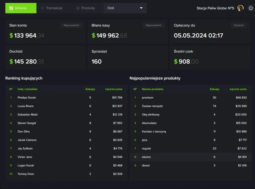 "Program oferuje także szeroką gamę statystyk dotyczących klientów i popularnych produktów, a także możliwość analizy danych z różnych okresów czasu. Sekcja "Transakcje" w aplikacji szczegółowo prezentuje ostatnie zakupy."