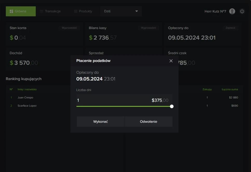 "Zarządzanie firmą odbywa się poprzez dwa rodzaje bilansów: bilans gotówki i bilans konta bankowego. Bilans gotówki jest zasilany w przypadku płatności gotówką, a konto w przypadku płatności kartą. Specjalna aplikacja "Moja firma" na tablecie pozwala wygodnie wypłacać środki, przy czym środki gotówkowe trafiają do ciebie w ręce, a środki z konta - na konto bankowe."
