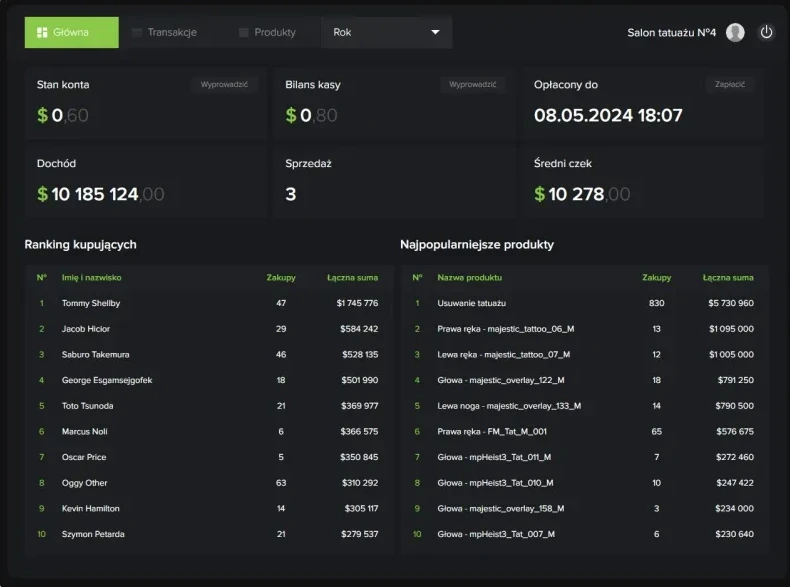 Zakup salonu tatuażu to proces dostępny poprzez rynek, aukcję na rynku lub zakup "z ręki" od innych graczy. Warto zauważyć, że w przypadku zakończenia aktywności w grze na serwerze, administracja może skonfiskować twój biznes na rzecz serwera.