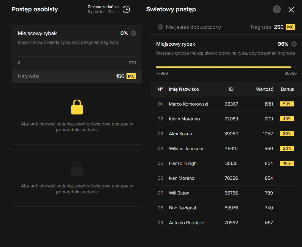 - Top 5 graczy, którzy wnieśli największy wkład w postęp wykonania światowego zadania, otrzymują bonus do nagrody.