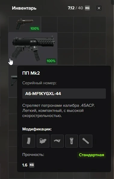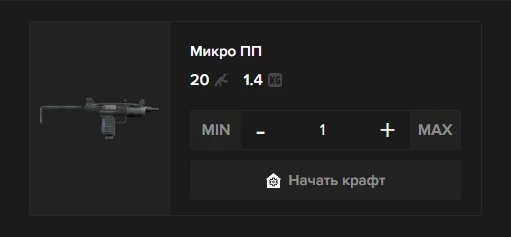 Мини ПП: шанс — 1% на 3–5 ящиков, вес — 1.5 кг, дальность — 120 м, тип патрона — 9x19 мм, урон — 10.