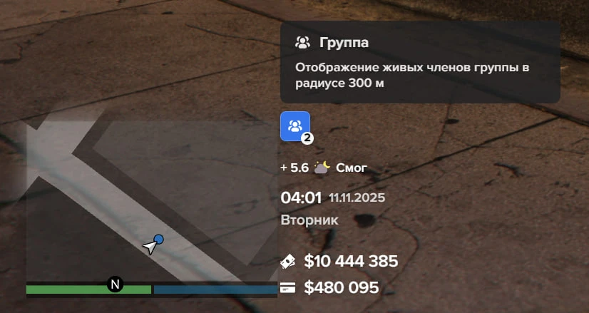 Индикаторы видны в радиусе 120 метров, а эффект «Группа» показывает количество живых участников в радиусе до 300 метров. Цвет метки и блип на карте совпадает с цветом игрока в группе.