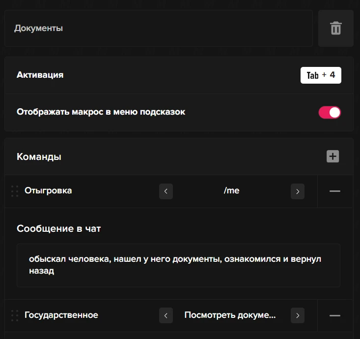Для быстрого и удобного воспроизведения повторяющихся отыгровок и действий в игре существует система макросов. Создать свои профили настроек можно в меню