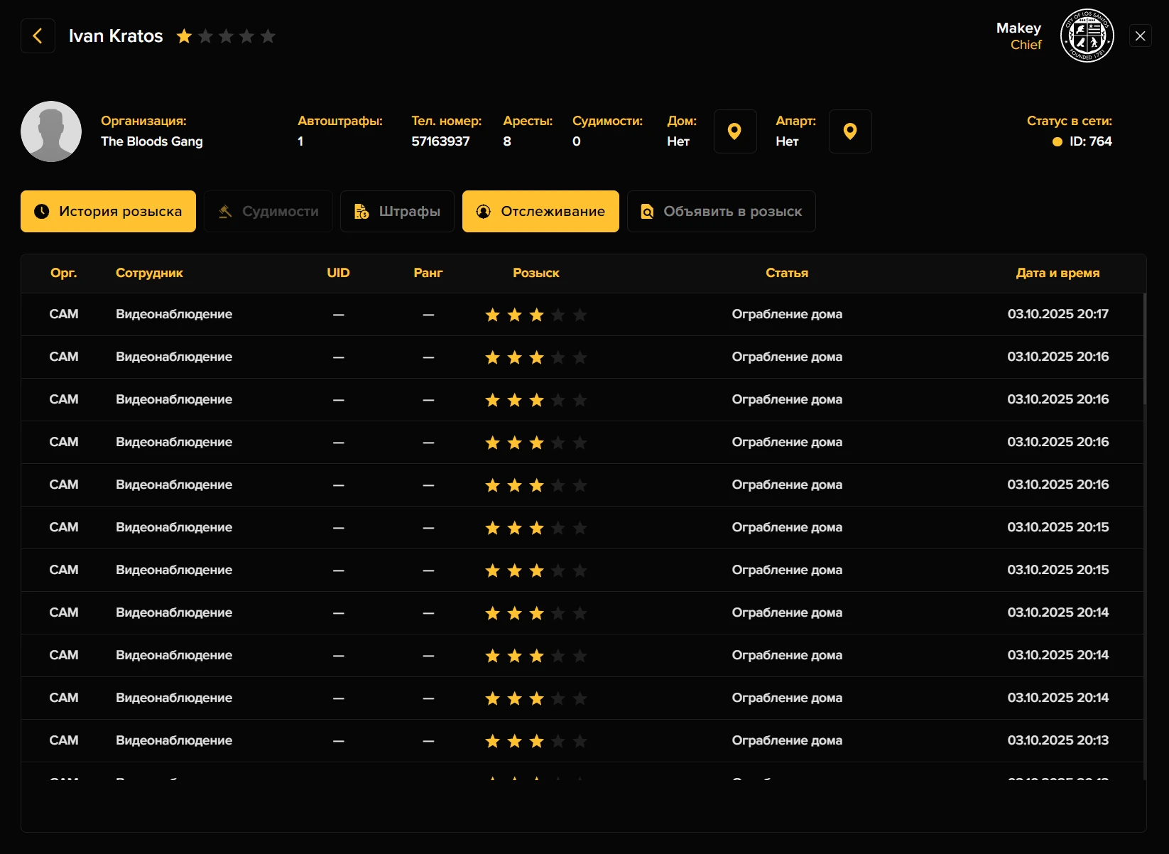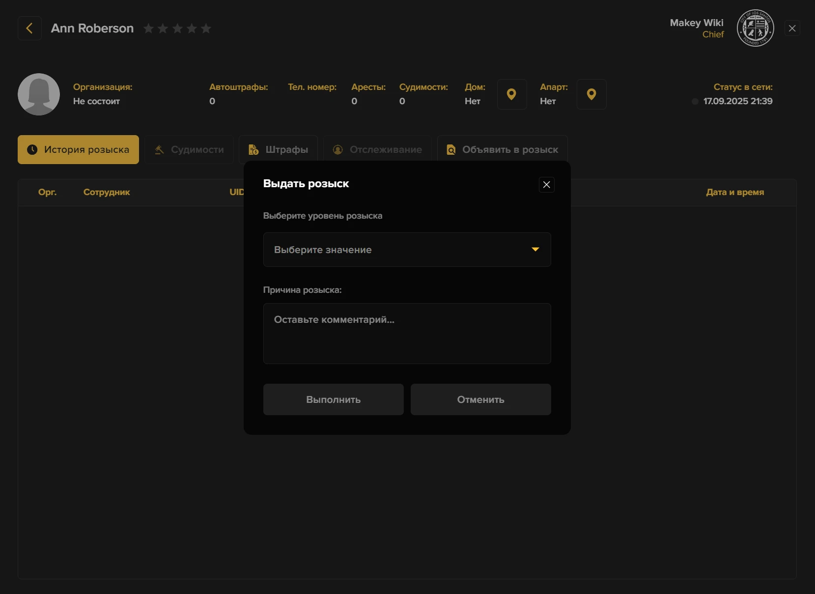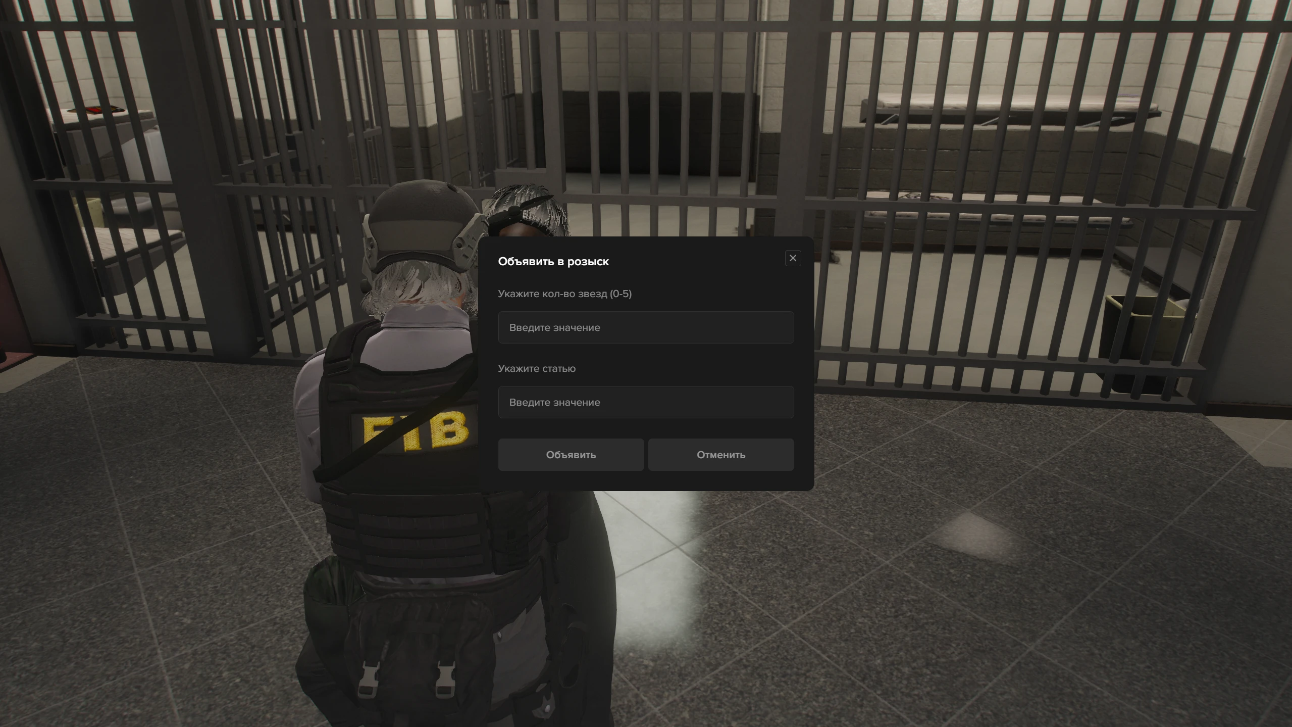 Для выдачи через меню взаимодействий используйте G - Фракционное - Объявить в розыск. Далее требуется указать уровень розыска и причину.