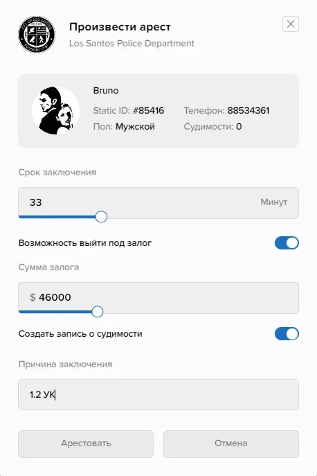 Можно выбрать срок заключения, предоставить возможность выхода под залог, определить сумму залога, принять решение о наложении судимости и, в завершении, указать причину ареста.