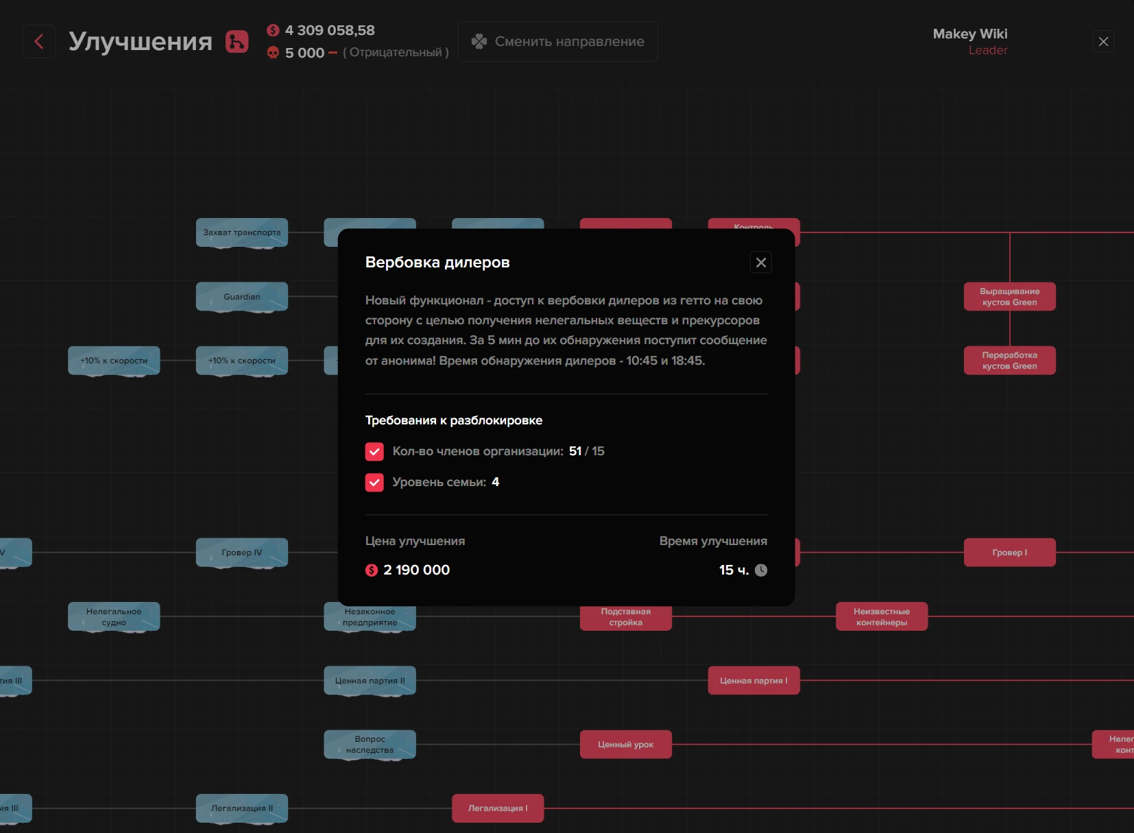 Захватывать дилеров могут члены криминальных семей, у которых открыто улучшение «Вербовка дилеров». Участники банд могут участвовать в мероприятии без дополнительных требований.