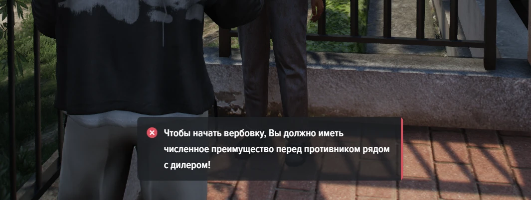 Для начала вербовки важно иметь численное преимущество перед противником рядом с диллером. В случае, если противников рядом нет, будет достаточно одного человека. Необходимо нацелиться на NPC огнестрельным оружием, после чего появится шкала вербовки.